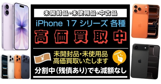 | 2025/9/19 | iPhone 17 / iPhone Air / iPhone 17 Pro / iPhone 17 Pro Max 未開封品・新品 未使用・中古品・ジャンク品 買取 強化中。 未開封品は特に高価買取いたします!! 買取価格等、お気軽にお問い合わせください。 |
